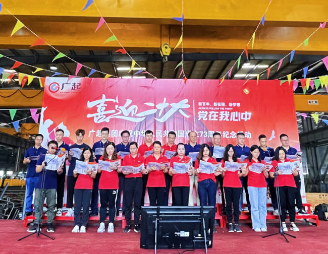 神州大地繁花似锦,祖国长空乐曲如潮。伴着金秋明媚的阳光,一年一度广起特色的国庆红歌汇唱活动如约而至。9月23日,广起集团全体员工在云浮厂区举行了“喜迎二十大 党在我心中”庆祝中华人民共和国成立73周年纪念活动。