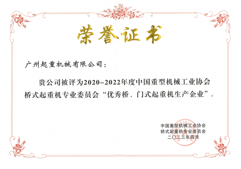 热烈祝贺我司荣获中国重型机械工业协会桥式起重机专业委员会2020-2022年度优秀桥、门式起重机生产企业,并再次当选中国重型机械工业协会桥式起重机专业委员会副理事长单位。