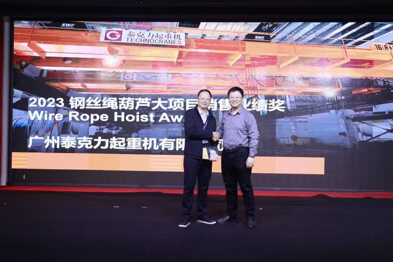 在此次盛会中,广州泰克力起重机有限公司凭借其在高端欧式起重机产品领域的卓越贡献与杰出表现,荣耀地获得了SWF速卫(中国)特别颁发的《2023年度钢丝绳葫芦大项目销售业绩卓越奖》。这一殊荣不仅深刻体现了广州泰克力起重机有限公司在推动双方合作迈向新高度的不懈努力,也彰显了双方在高端欧式起重机产品领域内携手并进、共创辉煌的紧密战略伙伴关系。