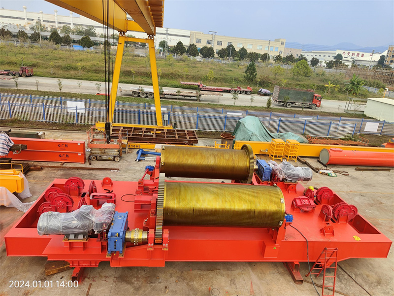 400T*150m门式起重机的上小车由车架、主动台车、平衡台车、下横梁、刚性支腿和柔性支腿构成,其刚性支腿和柔性支腿与下横梁不是常用的法兰连接,而是采用直接焊接的方式连接,加上车架外形尺寸大,如在车间内制作,则无法运出车间,只能在车间内分体制作,在露天货场进行拼装和机构装配,大大增加了制作和装配难度。上下小车的起升机构的卷筒与传动装置采用开式齿轮传动,卷筒的大齿轮直径达2180mm,如加工及装配精度不符合图纸要求,极易产生震动,加工和装配难度十分大。同时,由于上下小车的外形尺寸大,不满足陆路运输条件,需要采用船运的方式。项目时间紧,难度大。